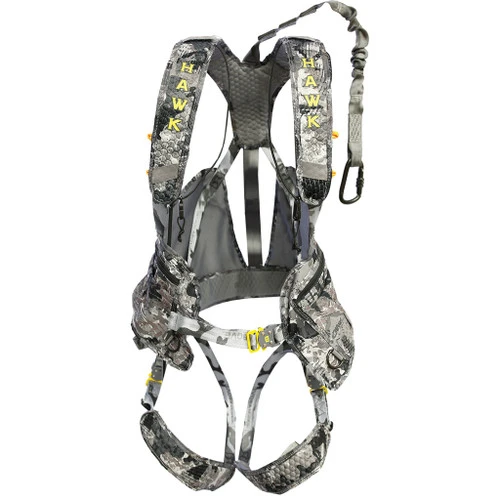 The Elevate Pro Safety Harness features one-hand quick set carabiner, flexible tether for 360 degree movement, lightweight silent bind cables, padded waist and shoulder straps for ultimate comfort, storage pocket for cell phone or gear, quick release leg buckles with adjustable leg straps, form fit technology, integrated gear hooks and adjustable and durable elastic chest strap.