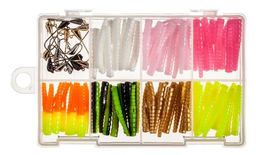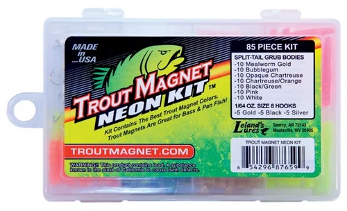The Trout Magnet Neon Kit from Leland Lures is an 85-piece collection of their brightest, deadliest Trout Magnet colors. Sized to fit your trout vest, the Kit comes with 7 different Trout Magnet body colors. Also included are 5 gold, 5 black, and 5 nickel 1/64 oz. shad-dart heads. Made in USA.