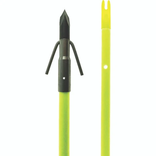 A chartreuse fiberglass bowfishing arrow with Gar point, nock and bottle slide.